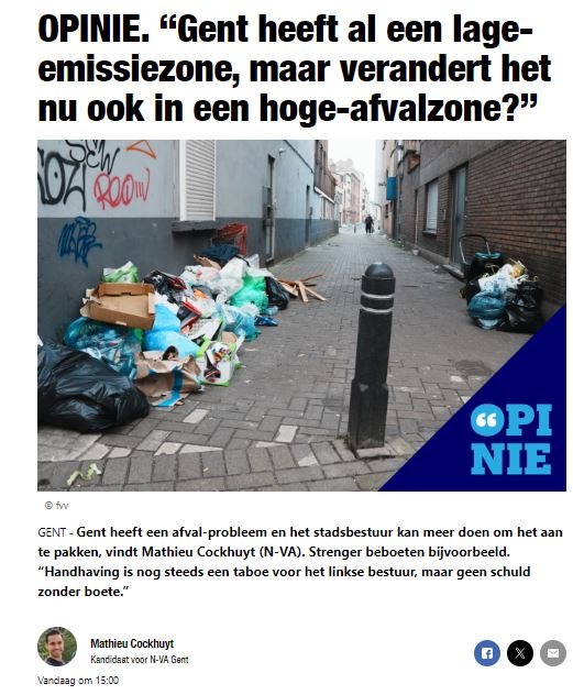 Fietsen door Gent biedt een trieste inventaris: sigarettenpeuken op de stoep, blikjes en plastic flesjes langs de berm, fastfoodverpakkingen in de parken. De afvalproblematiek in Gent is één van de grootste uitdagingen voor de komende jaren. In 2023 haalde IVAGO maar liefst 1.200 ton zwerfvuil en 900 ton sluikstort op. Dat is 13 procent meer dan in 2022. Ook het aantal meldingen van sluikstort steeg met 16 procent, een triest record. Gent heeft al een lage-emissiezone, maar verandert het nu ook in een hoge-afvalzone?