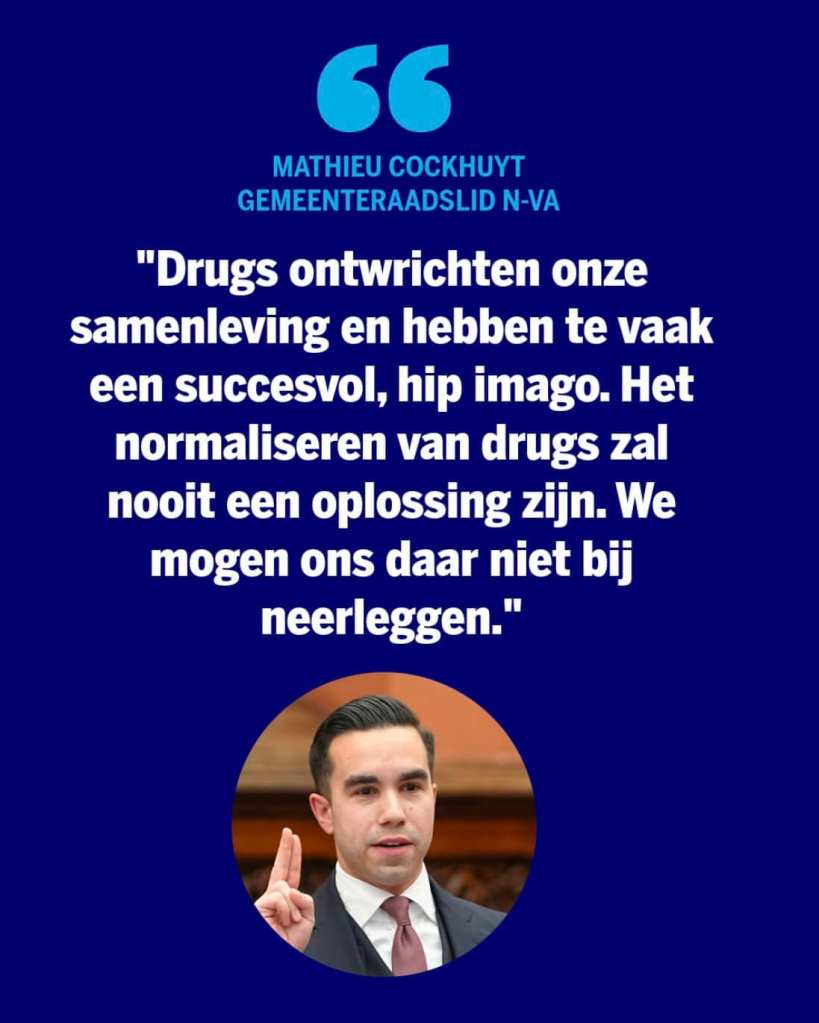 “Drugs ontwrichten onze samenleving en hebben te vaak een succesvol, hip imago. Denk maar aan de xtc-expo die het stadsbestuur vorig jaar nog zelf heeft gesubsidieerd. Het normaliseren van drugs zal nooit een oplossing zijn.”