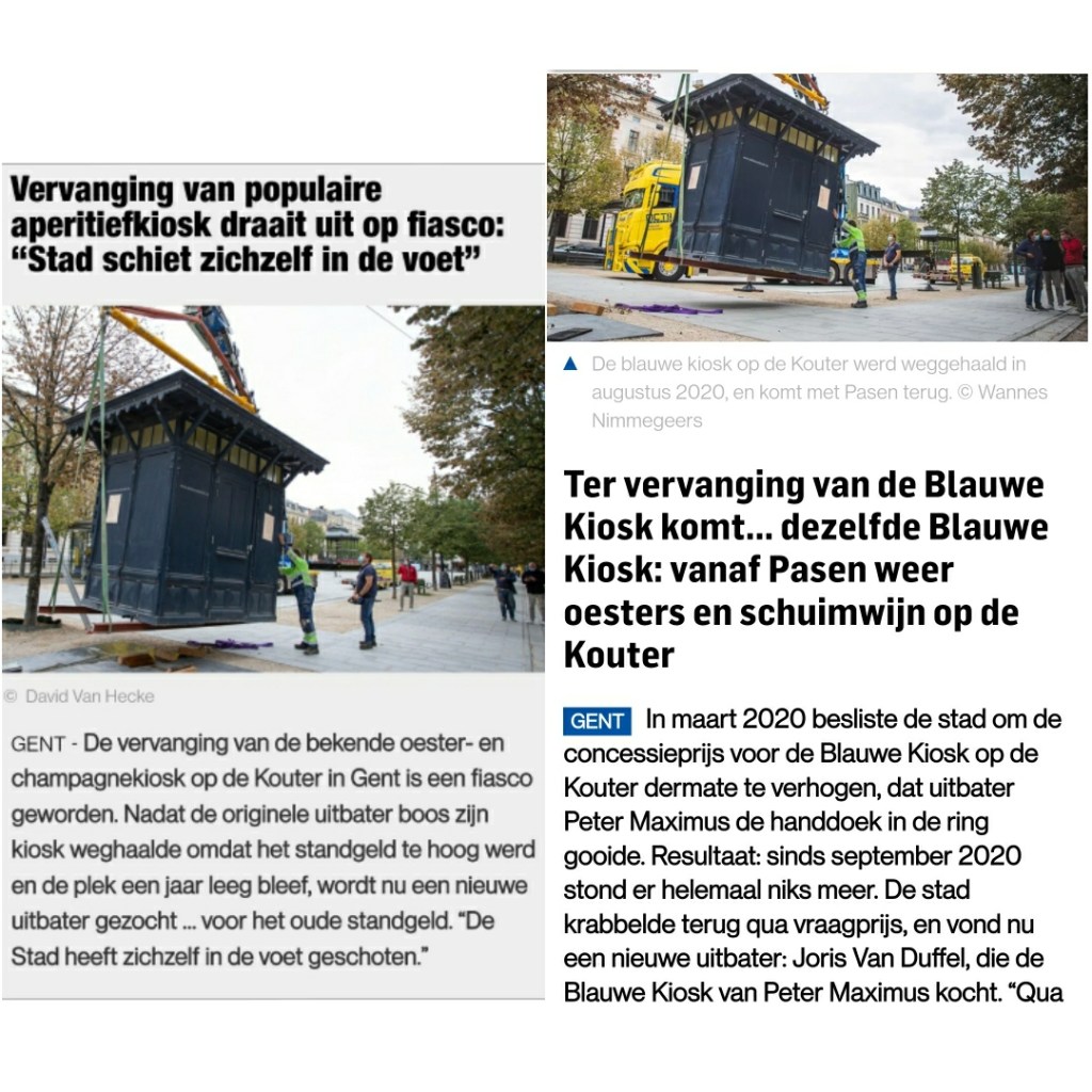 Ken je dat spreekwoord? De vorige uitbater van de Blauwe Kiosk alvast wel. Anderhalf jaar geleden verdween onze vertrouwde kiosk aan de Kouter. Wat was er aan de hand? Wel, gezien de stijgende schuldenput in Gent (1 miljard euro tegen 2025) dachten ze op de Botermarkt dat er nog wel wat te halen viel bij de lokale ondernemers. In februari 2020 kreeg Peter Maximus, uitbater van de Kiosk sinds 1998, te horen dat zijn standgeld steeg van 7000 euro naar 20.000 euro. Zomaar eventjes een verdrievoudiging! Kennelijk dacht de Gentse Vivaldi dat ze een geldkoe hadden gevonden. De man kende zijn cijfers en wist dus dat deze prijs onrealistisch was. Er zat niks anders op dan na meer dan 20 jaar de handdoek in de ring te gooien. De stad schoot zichzelf in de voet, een terugkerend fenomeen. De Gentenaar miste zijn kiosk, een ondernemer was zijn inkomen kwijt en de stad had nu géén inkomsten meer. Weg sfeer.
