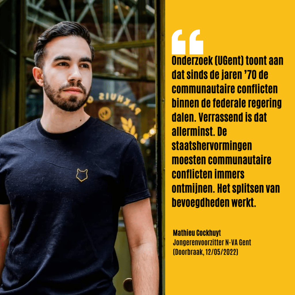 Het is vrij uniek in de wereld, maar Vlamingen voeren hun ontvoogdingsstrijd niet met het zwaard, maar met de pen. Wij laten geen bloed, maar inkt vloeien. Zijn er dan geen communautaire angels meer en werkt dit land dus ‘zo slecht nog niet’ zoals De Morgen liet uitschijnen? Geenszins. Die angels worden nu uitgevochten in ellenlange regeringsformaties, met lopende zaken eerder als regel dan als uitzondering. Denk aan de onderhandelingen van 2007, 2010 en 2019. Dat het splitsen van bevoegdheden pacificerend werkt is dus de enige logische conclusie van dit onderzoek. ‘Hoe minder je moet samenwerken, hoe minder je kan botsen en vechtende groepen uiteen moet halen’, besluit ook Vandenberghe.