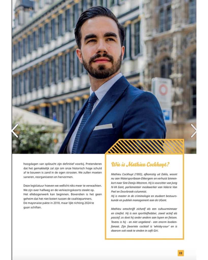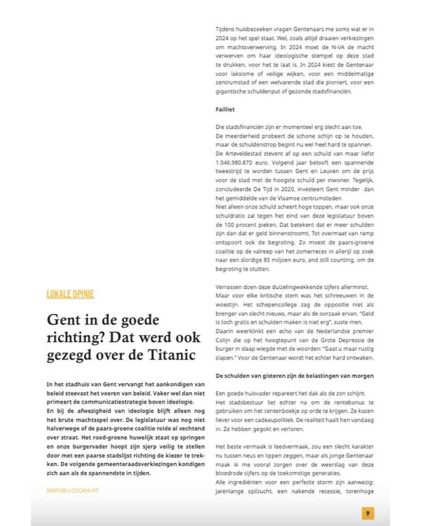 Tijdens huisbezoeken vragen Gentenaars me soms wat er in 2024 op het spel staat. Wel, zoals altijd draaien verkiezingen om machtsverwerving. In 2024 moet de N-VA de macht verwerven om haar ideologische stempel op deze stad te drukken, voor het te laat is. In 2024 kiest de Gentenaar voor laksisme of veilige wijken, voor een middelmatige centrumstad of een welvarende stad die pioniert, voor een lege stadskas of gezonde stadsfinanciën.