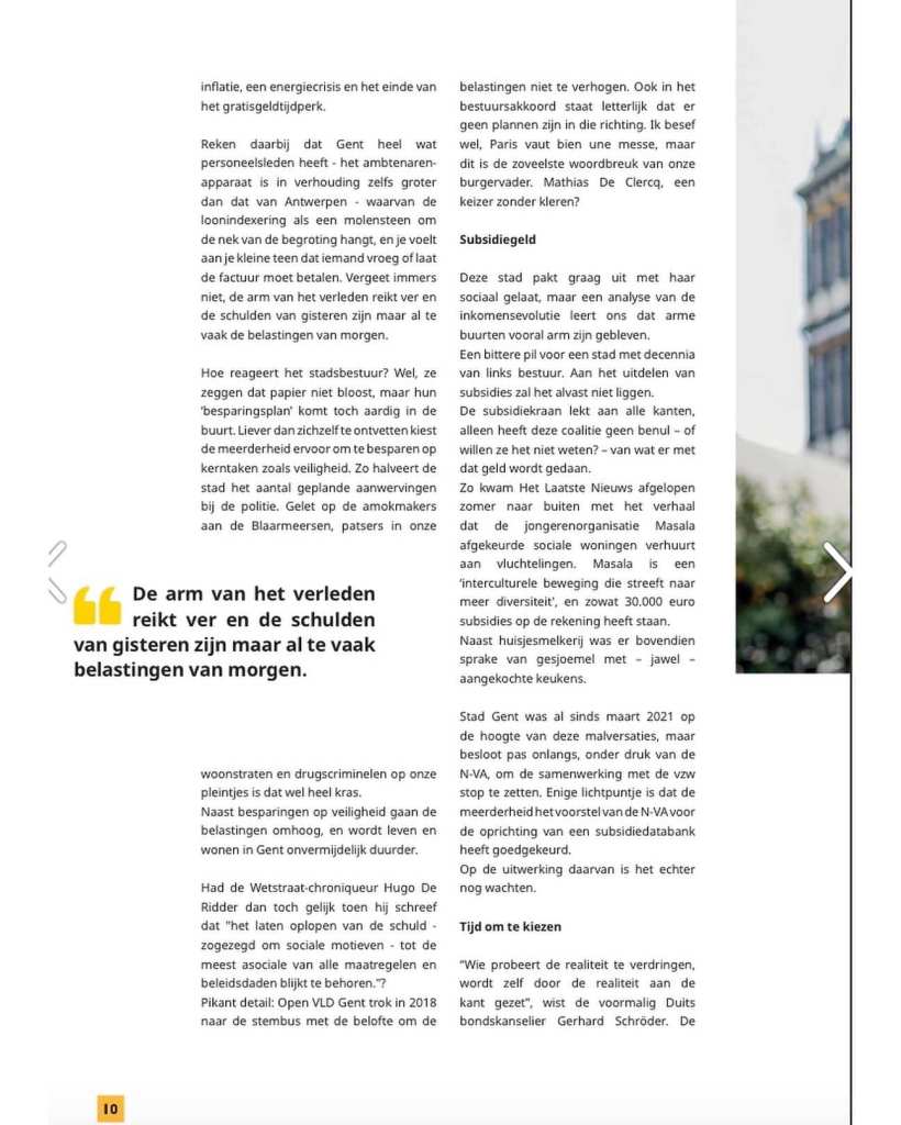 Reken daarbij dat Gent heel wat personeelsleden heeft – het ambtenarenapparaat is in verhouding zelfs groter dan dat van Antwerpen – waarvan de loonindexering de komende jaren een meerkost van 180 miljoen euro betreft, en je voelt aan je kleine teen dat iemand vroeg of laat de factuur moet betalen. Vergeet niet, de arm van het verleden reikt ver en de schulden van gisteren zijn maar al te vaak de belastingen van morgen.